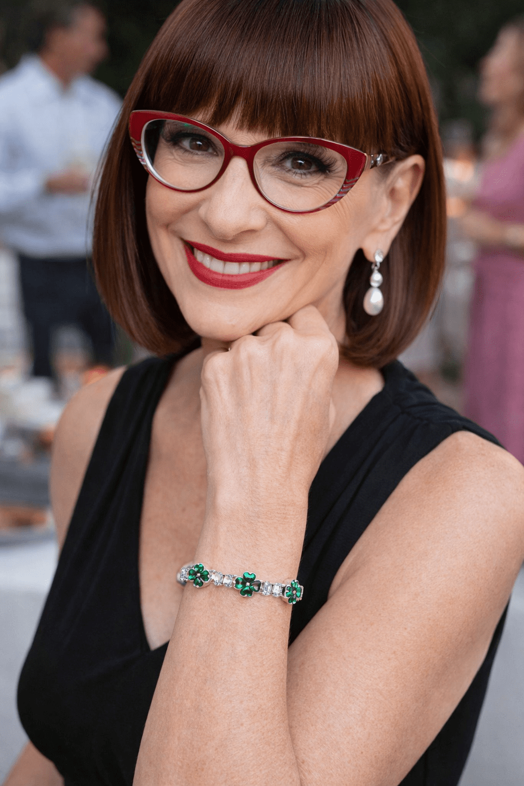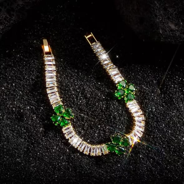 This darling new tennis bracelet features square-cut clear crystals accented with three emerald four-leaf clovers, each petal lovingly shaped like a tiny heart — a beautiful symbol of good fortune and heartfelt wishes.