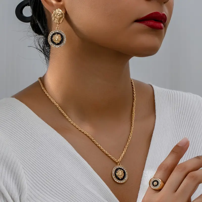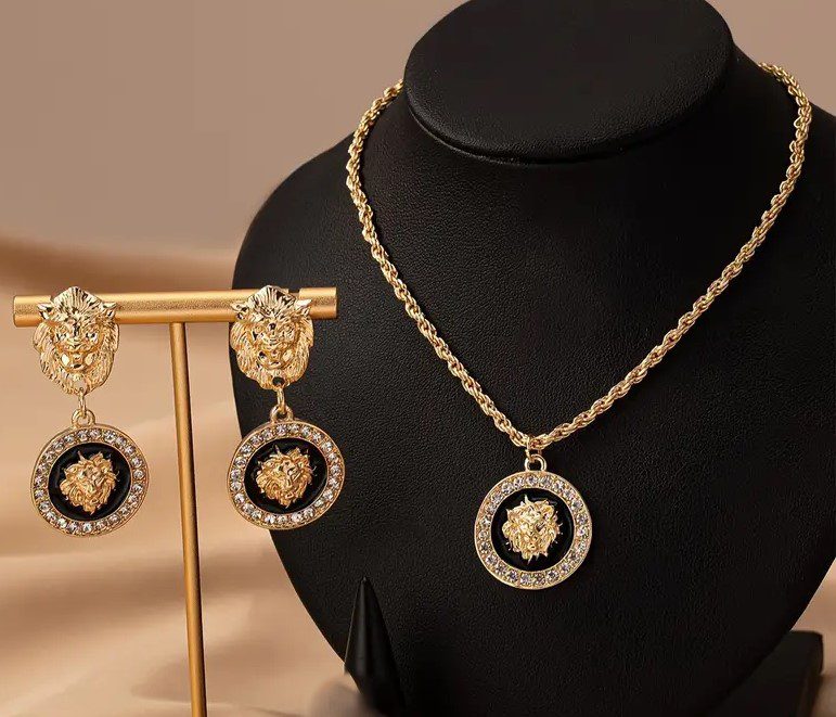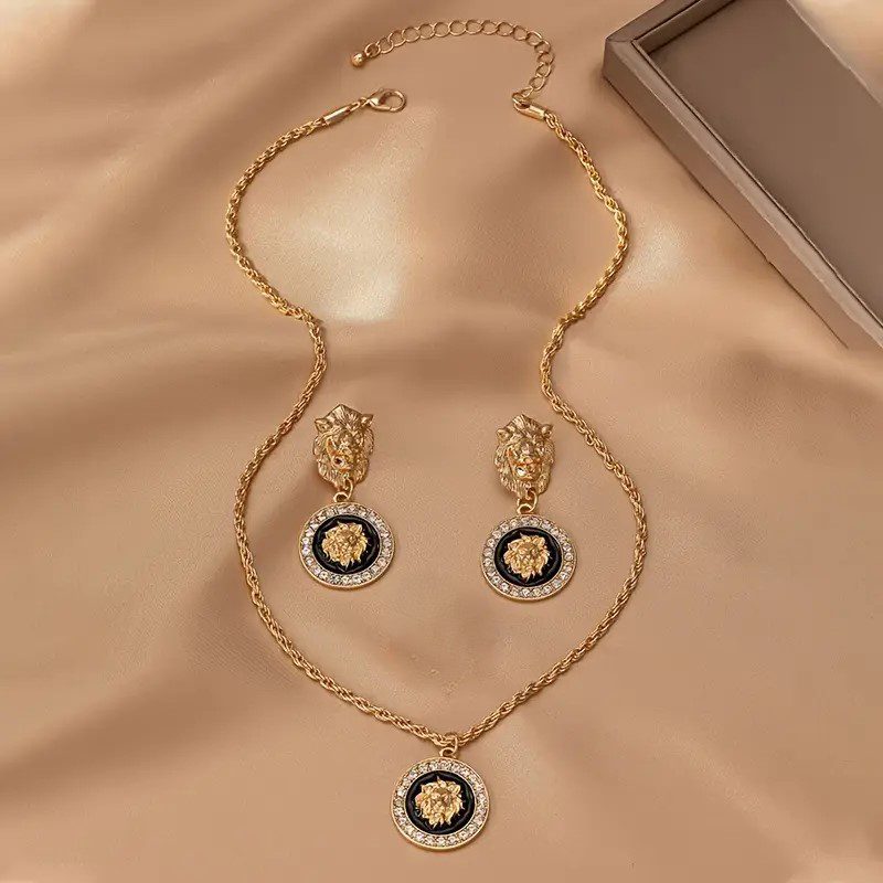 Unleash your inner power with Regal Roar—a striking necklace and earring set designed to make a statement. The bold lion head pendant in dramatic black and gold rests on a luxurious 20″ rope-style chain, paired with matching earrings that complete the look.