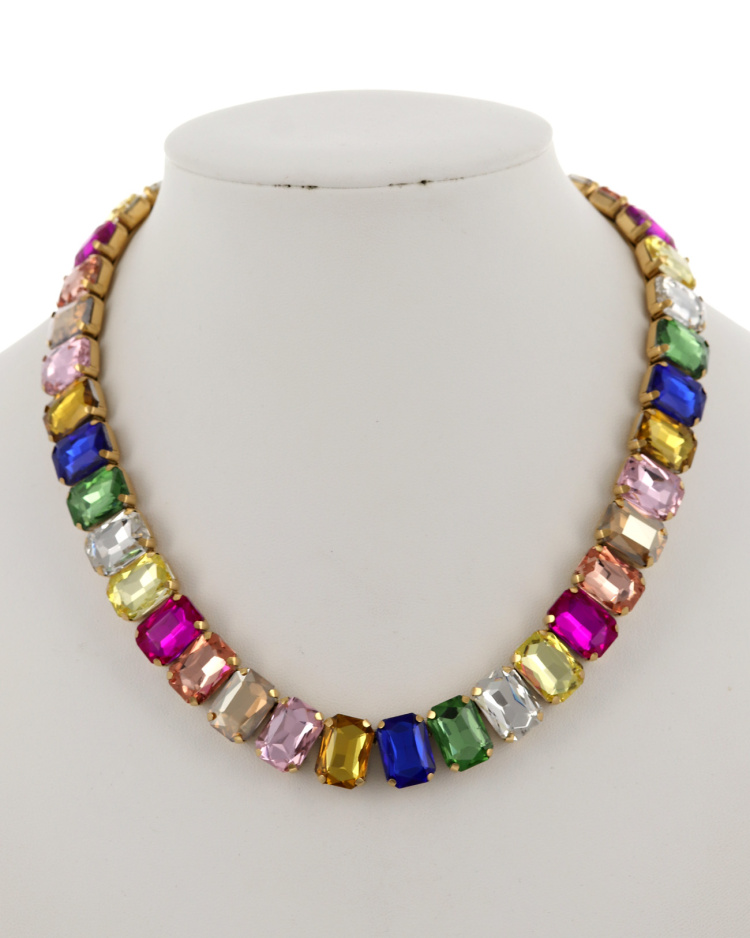 The Chromatique Elegance Necklace features a striking arrangement of multicolour faceted crystals, each thoughtfully placed to create a harmonious and luminous spectrum. Set in warm gold tone, the stones catch the light beautifully — vibrant yet refined, bold yet effortlessly wearable.